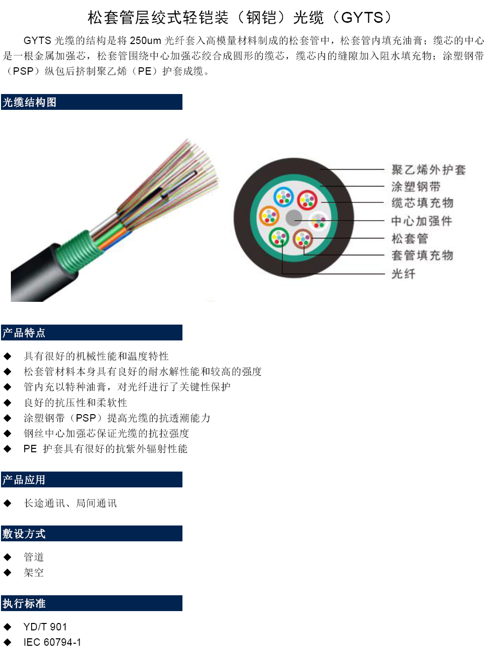 松套管层绞式轻铠装(钢铠)光缆(GYTS)